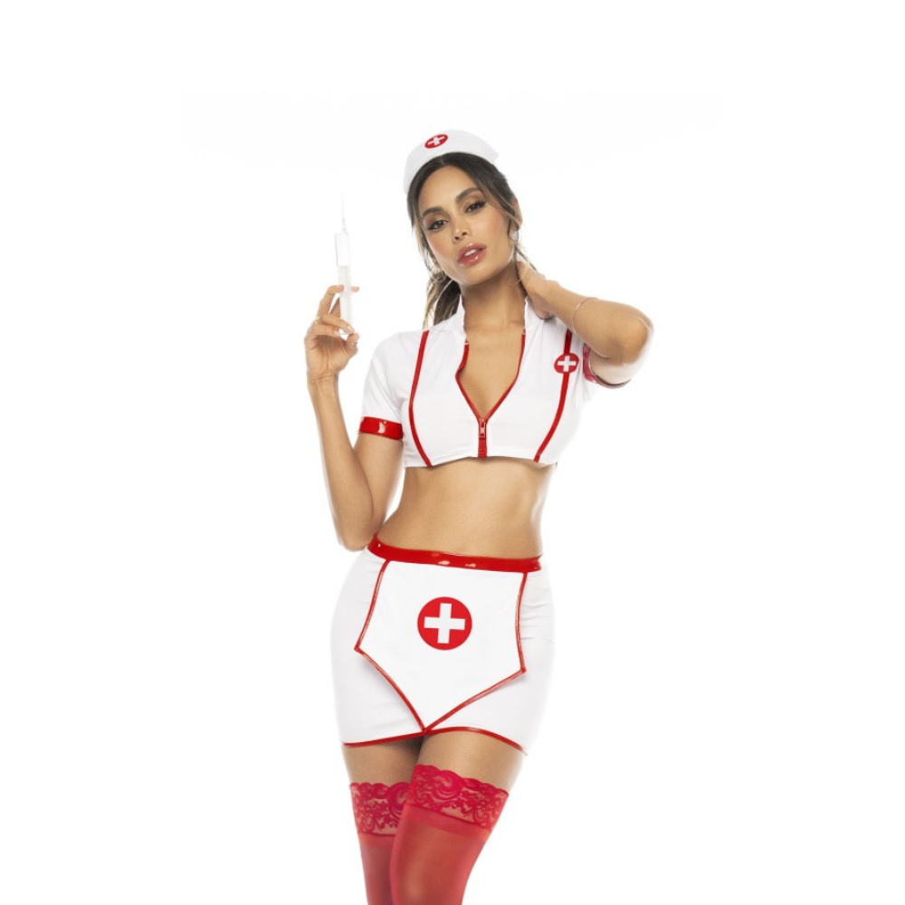 Costume d'infirmière sexy 3 pièces conçu pour réparer les cœurs brisés, comprenant un haut zippé, une jupe et une coiffe assortie (bas non inclus).